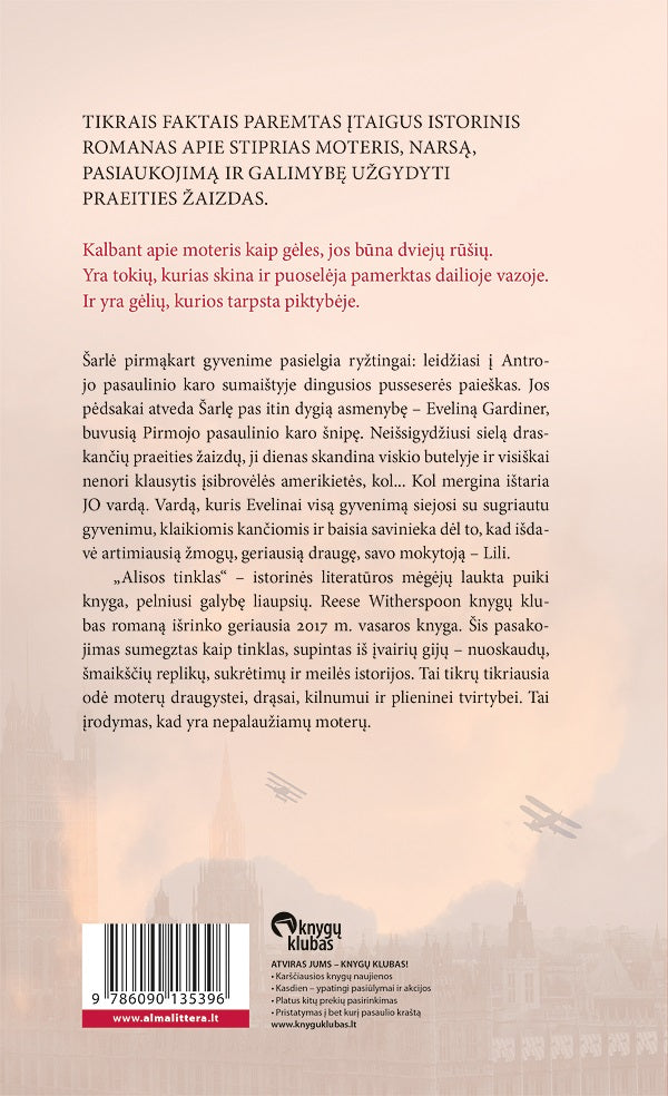 „Alisos tinklas“ – istorinės literatūros mėgėjų laukta puiki knyga, pelniusi galybę liaupsių. Reese Witherspoon knygų klubas romaną išrinko geriausia 2017 m. vasaros knyga. Šis pasakojimas sumegztas kaip tinklas, supintas iš įvairių gijų – nuoskaudų, šmaikščių replikų, sukrėtimų ir meilės istorijos. Tai tikrų tikriausia odė moterų draugystei, drąsai, kilnumui ir plieninei tvirtybei. Tai įrodymas, kad yra nepalaužiamų moterų.