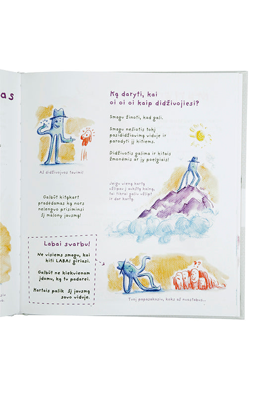 Ši jausmų knygelė ypatinga – ji dvipusė! Vienoje pusėje rasi malonius jausmus, o kitoje – ne tokius malonius. Tačiau tai nereiškia, kad jie blogesni! Kiekvienas jausmas – tai atskiras personažas, ir juos pažinęs nesunkiai galėsi susidraugauti. Susipažinęs su jausmais parodyk juos kitiems ir pagalvok, kaip jie jaučiasi šiandien.