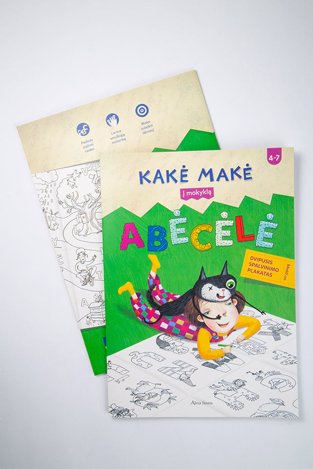 A, B, C, o kur dar Ą ir Č! Kiek daug įvairių raidelių sutinkame kiekvieną dieną... Jas visas, nuo A iki Ž, pažinti bus kur kas lengviau ir smagiau su dvipusiu (net 84 x 60 cm dydžio) Kakės Makės abėcėlės plakatu!