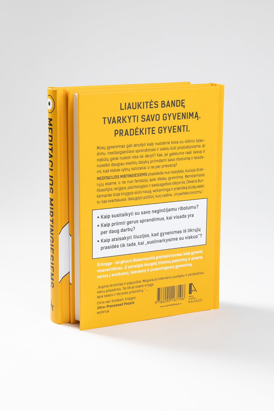 Meditacijos mirtingiesiems prasideda nuo realybės, kurioje iš tikrųjų esame, o ne nuo fantazijų apie idealų gyvenimą. Remdamasis filosofijos, religijos, psichologijos ir savipagalbos idėjomis, Oliveris Burkemanas šioje knygoje siūlo naują, veiksmingą ir praktišką būdą siekti to, kas svarbiausia: požiūrį, kurį vadina „imperfekcionizmu“.