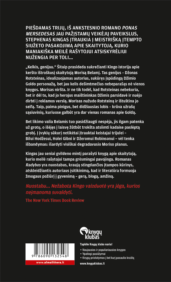 Kingas jau gvildeno mintį parašyti knygą apie skaitytoją, kurio meilė rašytojui tampa grėsmingai pavojinga. Romanas Radybos yra nuostabus, kraują stingdančios įtampos kūrinys, atskleidžiantis autoriaus įsitikinimą, kad ir literatūra formuoja žmogaus požiūrį į gyvenimą – gerą, blogą, amžiną.